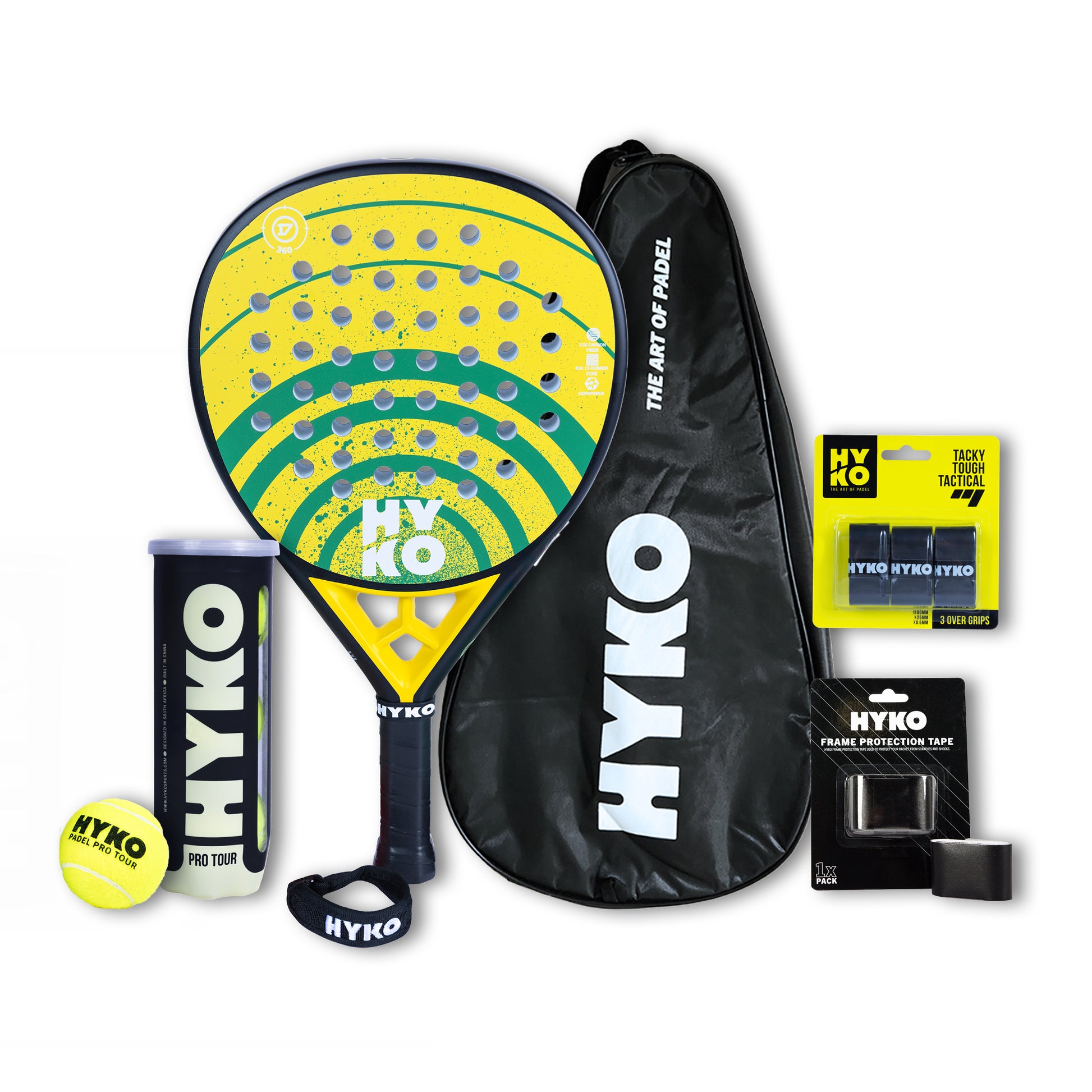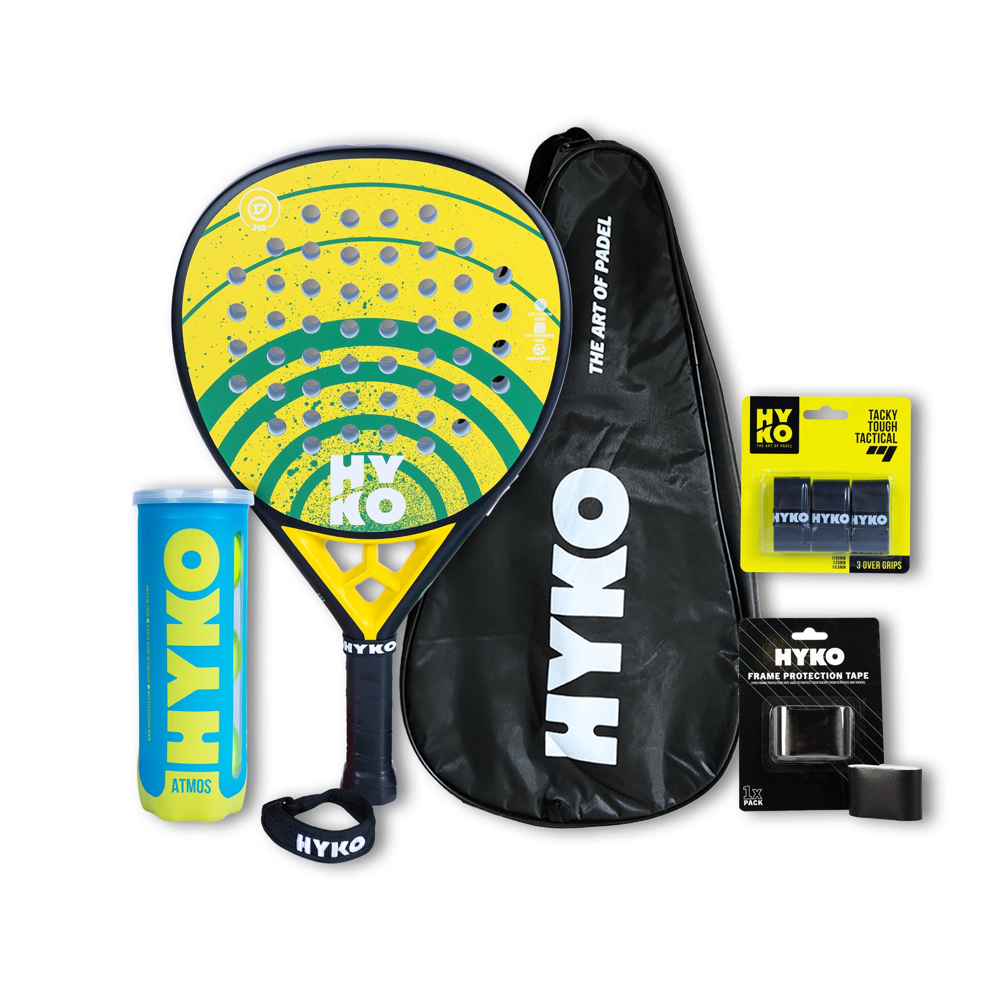 Built around the HYKO 360 Gold from the AB de Villiers collection, this combo gives you a premium power setup plus the essentials: protection, grip upgrades, and your choice of Hyko ball can. It’s the “ready-to-compete” kit for players who want maximum confidence and output.